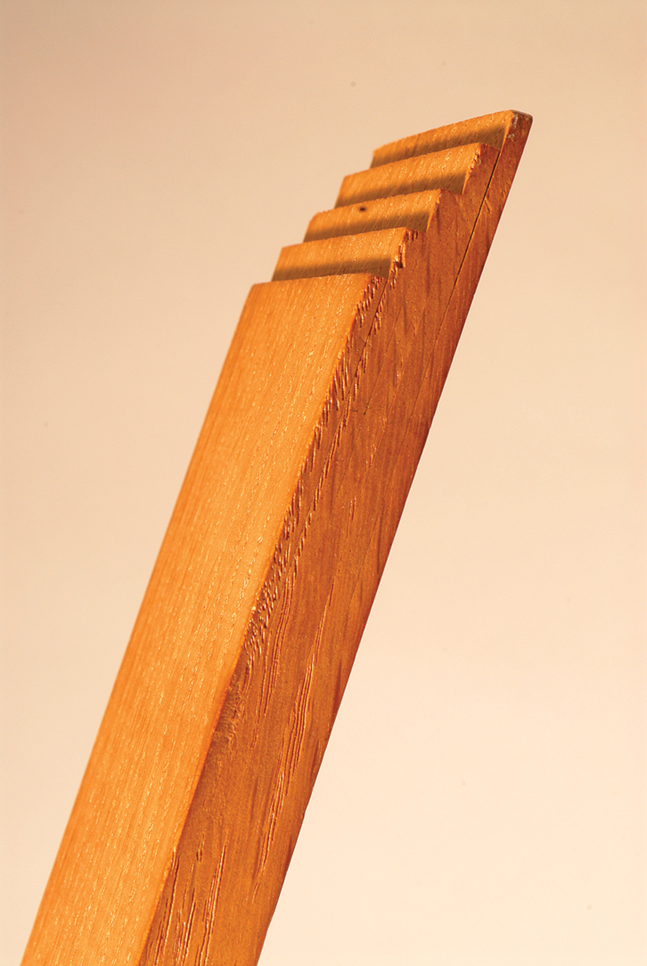Cut then curved. This example of curved, tapered lamination in English oak shows how the glue lines can virtually disappear. They only become visible near the end, in the waste piece, where the clamping pressure was not adequate.