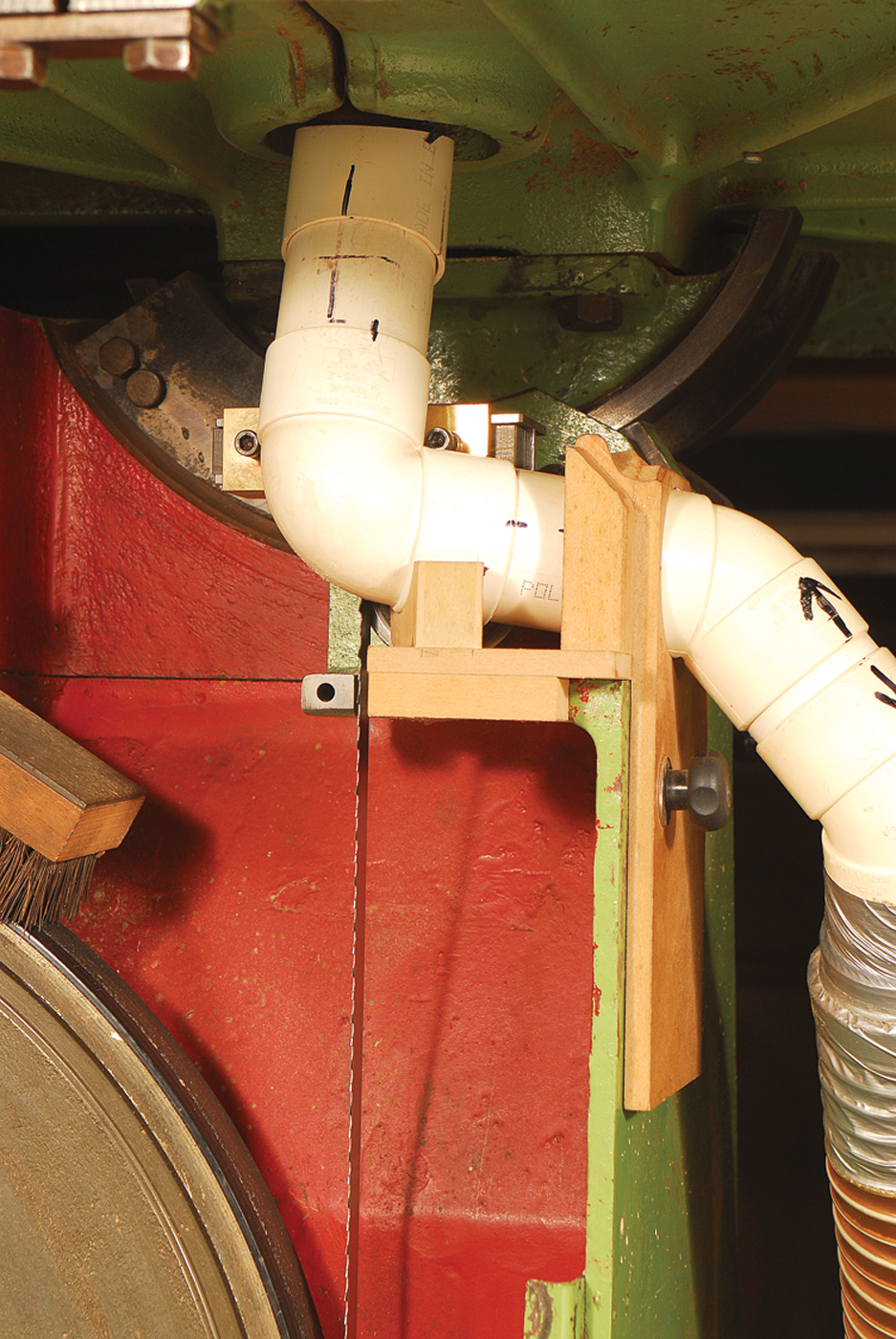 After many hours of thought and experiment, I managed to build the “wrap around” dust extraction unit, which you can see at left. This allows the table to tilt to 45° and collects dust as near to the source as possible. It makes the machine more pleasant to use. Most extraction points are too far from the throat. Wind generated by the wheels and blade carry dust around inside the case, over the top and eventually blowing it in your face. With my setup, I find virtually no dust at all on the ledges of the door and casting when the blade is changed.