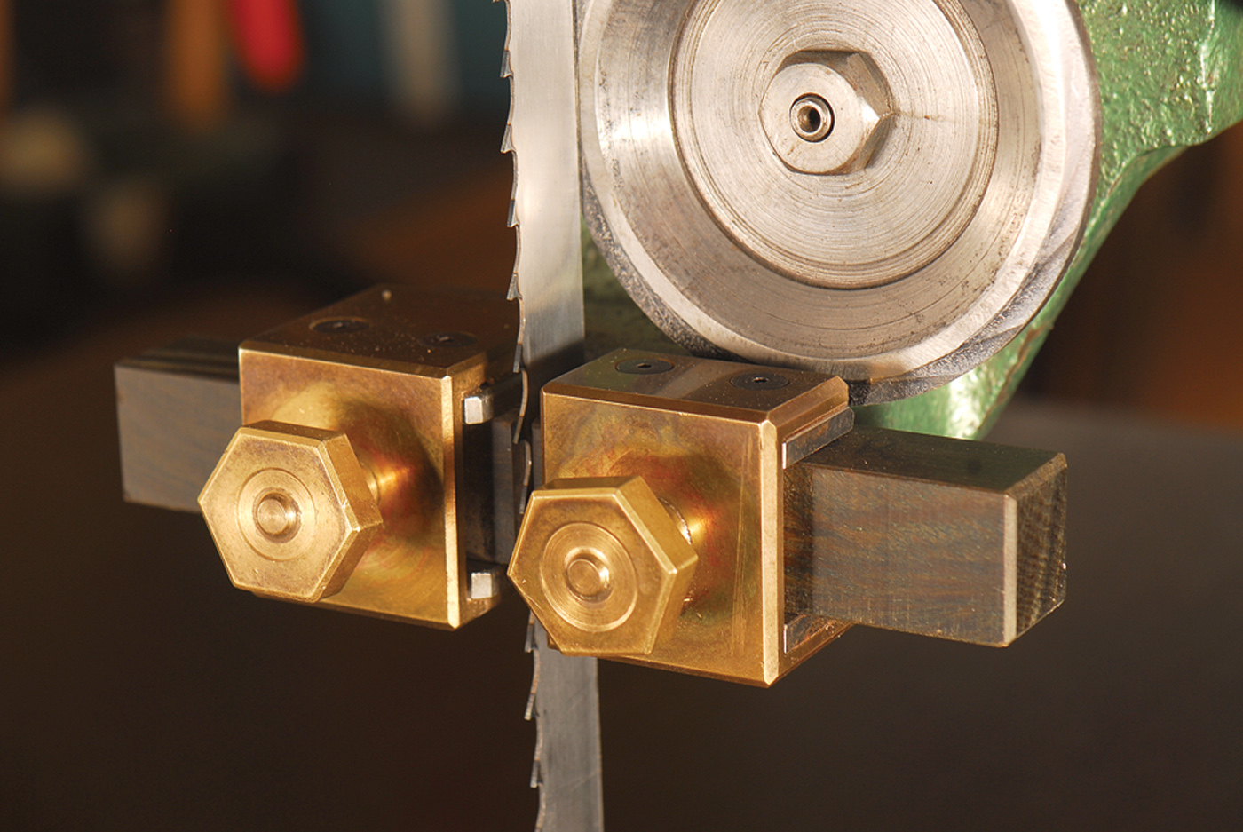 Guide setting is a delicate operation, as the blade must not deflect at all for precision work. My blocks slide easily in their holders. I bring the first one up to the blade with gentle finger pressure. The blade tension is sufficient to slide the block out again if I have pressed too hard. This guide is now secured with the brass knob. The second guide is then pressed gently against the opposite side of the blade. If any deflection is seen, I allow the blade to push it back, then secure its clamping knob. By alternating several times from side to side, it is quite easy to arrive at zero clearance with no deflection.