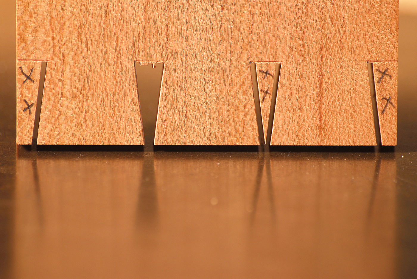 Remarkably, the finish left by the .022″-thick, 3tpi, 5⁄8” “meat & fish” blade that I use for fine work and veneer cutting is just as good as that left by my best dovetail saw, even in 3⁄8“-thick hardwood. So from my point of view it is win-win – all the way to a good fit.
