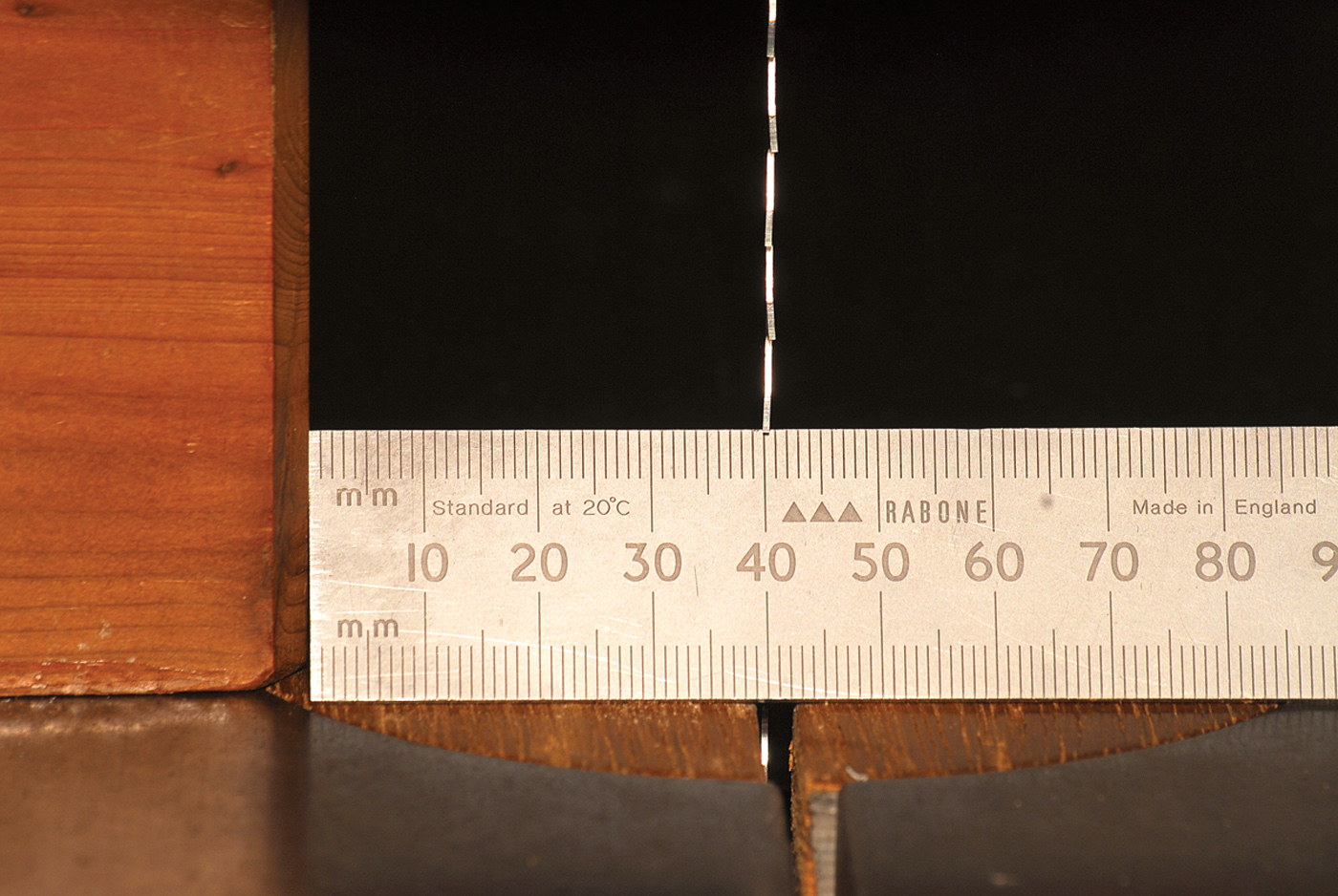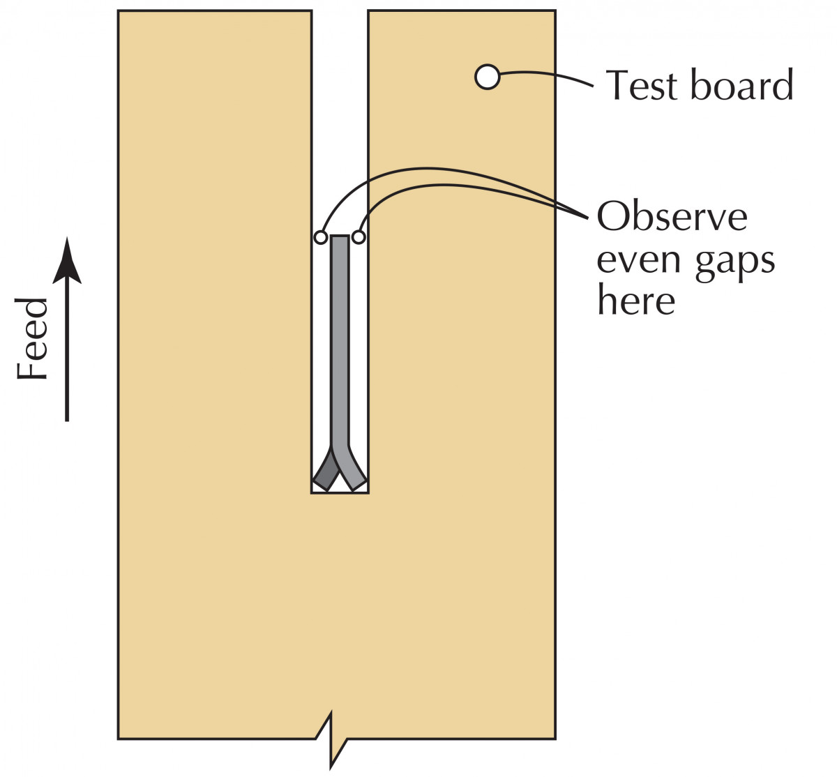 Set up a straightedge parallel to the edge of the test piece, near the right-hand edge of the saw’s machine table. Then make three marks with a fine permanent marker.