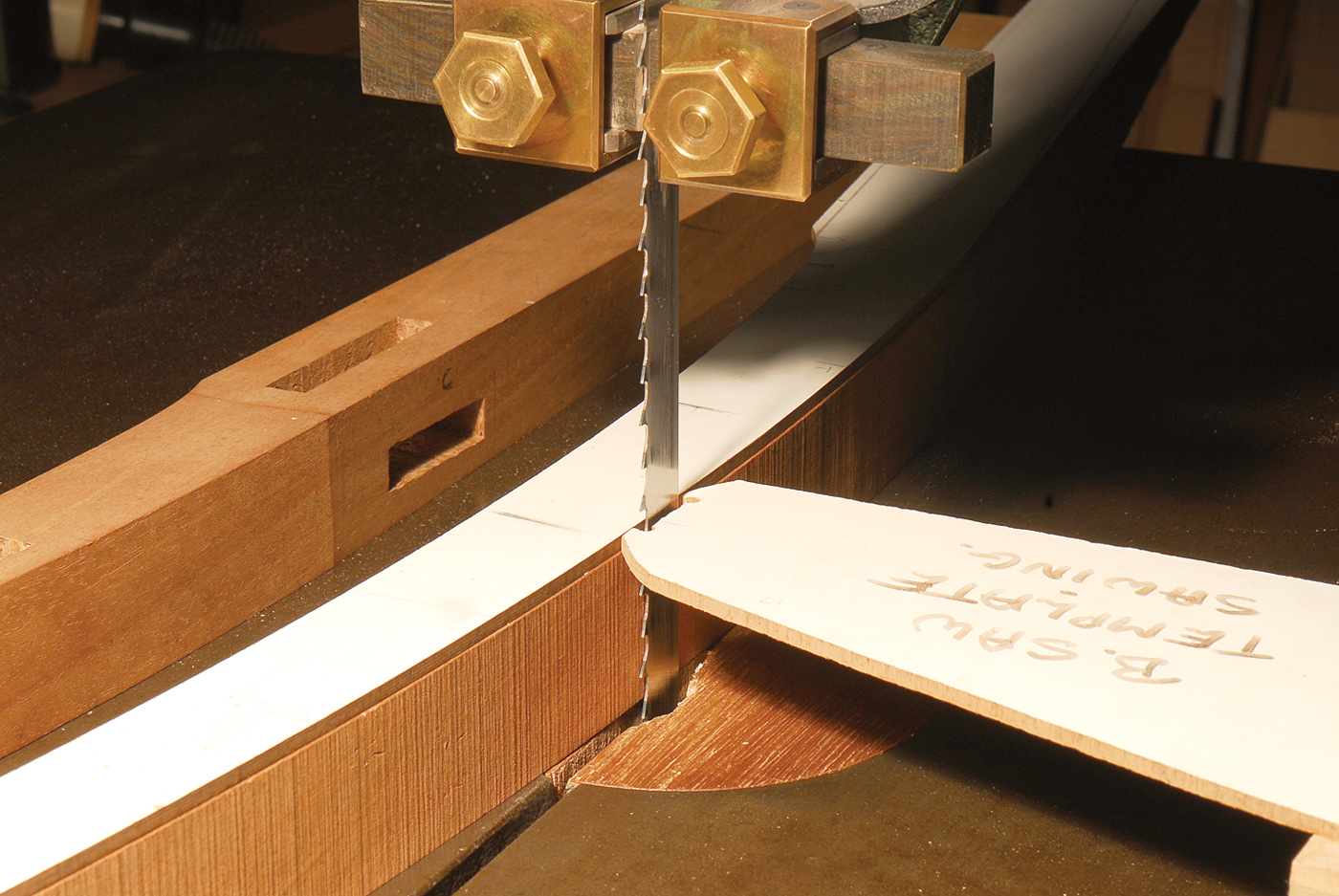 Cutting copies. Above is shown my template sawing setup. The guide follows the template (which is attached to the work) and copies its shape onto the work below.