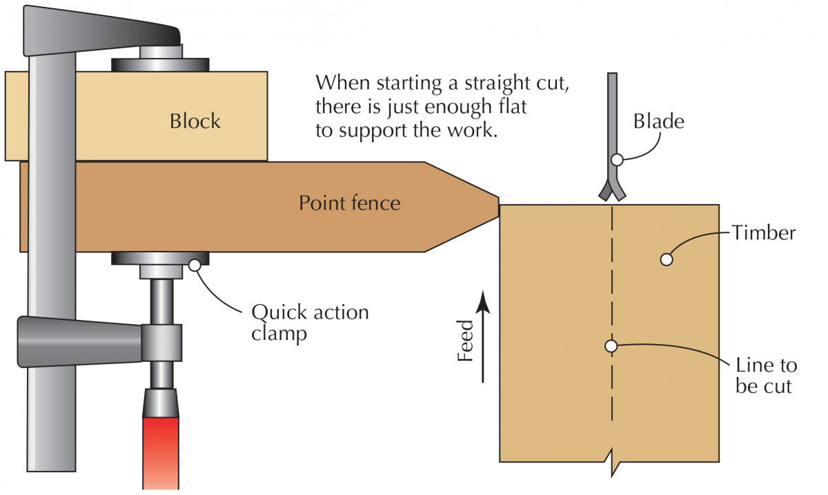 If you practice and become familiar with a point fence you will rarely use anything else. It is a little intimidating for beginners, as some lateral twist must be applied to the workpiece at the start, and for the majority of the cut. The vital requirement is that the work does not drift away from the point (which is in fact a small flat) during the cut. The flat is essential for the start of a cut and must be positioned correctly relative to the cutting edge of the blade. Point fences can be made at differing heights, and setting one is a breeze as only one ruler measurement need be made. (A single quick-acting clamp secures the fence).