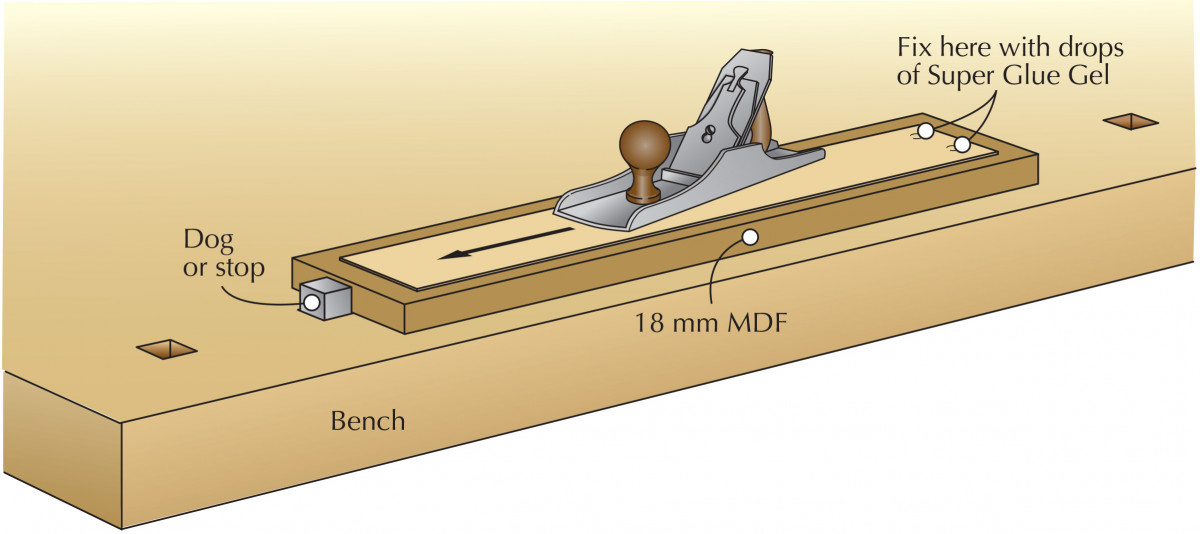 Securing thin veneers for hand planing/thicknessing. Use drops of Super Glue Gel on your MDF board to keep the work in tension.