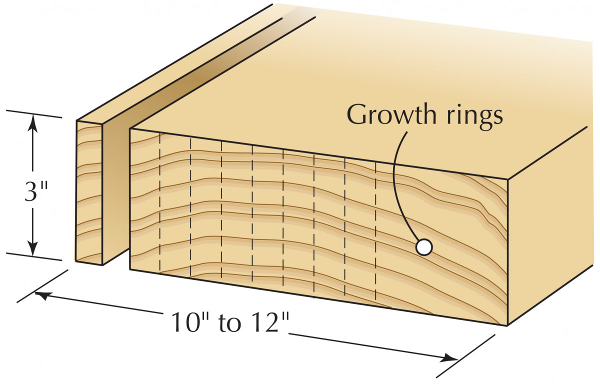 The ability to resaw thick timber has many applications. I now follow a tip from Robert Ingham to create thin quartersawn stock that’s useful for drawer and box making. I start with the widest available 3″-thick planks of timbers, such as black cherry or maple. These are invariably plain-sawn, so if resawn into 3⁄8” strips, the resulting material is almost perfectly quartersawn, as shown in the drawing above. Once a face side and edge have been machined, the sequence is to rip off a strip, then re-plane the edge before cutting the next strip.