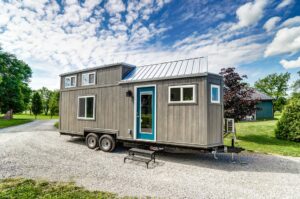Set on a double-axle trailer with a lightweight yet sturdy steel frame, this tiny home blends craftsmanship and charm in a way that feels anything but small. The exterior is clad in sleek LP Vertical Smart Siding in driftwood stain, paired with an aluminum gable roof, and a generous exterior storage box is included for added practicality.